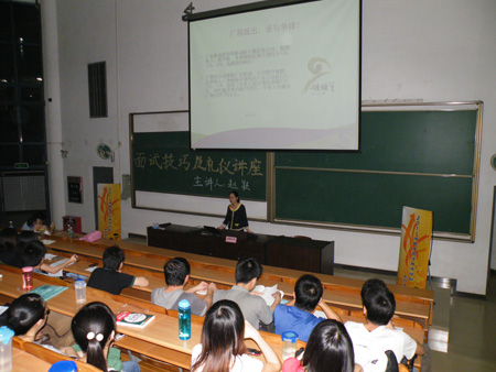 赵老师进行了简单的自我介绍和广州移动公司的企业文化介绍后,就开始了以”How to Be Yourself”为主题的精彩演讲。作为一名已有10年人力资源管理经验的人力资源部经理,她结合自己的经验,为现场的同学们解剖了什么是面试,分析了各类人才筛选形式以及公司企业对应聘者的考察内容。赵老师提出,面试者最重要的是“Be ourselves”,主要可以通过客观地认识自己,开放式地看待环境,获得或了解求职信息以及专业地推销自己四方面达到。之后,赵老师切实地回答了现场同学的提问,把全场气氛推向高潮。