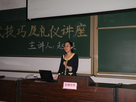 5月11日晚,我院2011届就业优才提升计划之面试技巧与礼仪讲座于教四108室举行。广州移动人力资源部员工关系室经理赵颖受邀作培训,团委书记鲍金勇老师、辅导员周志荣老师以及07、08、09级大部分学生全程参与了讲座。