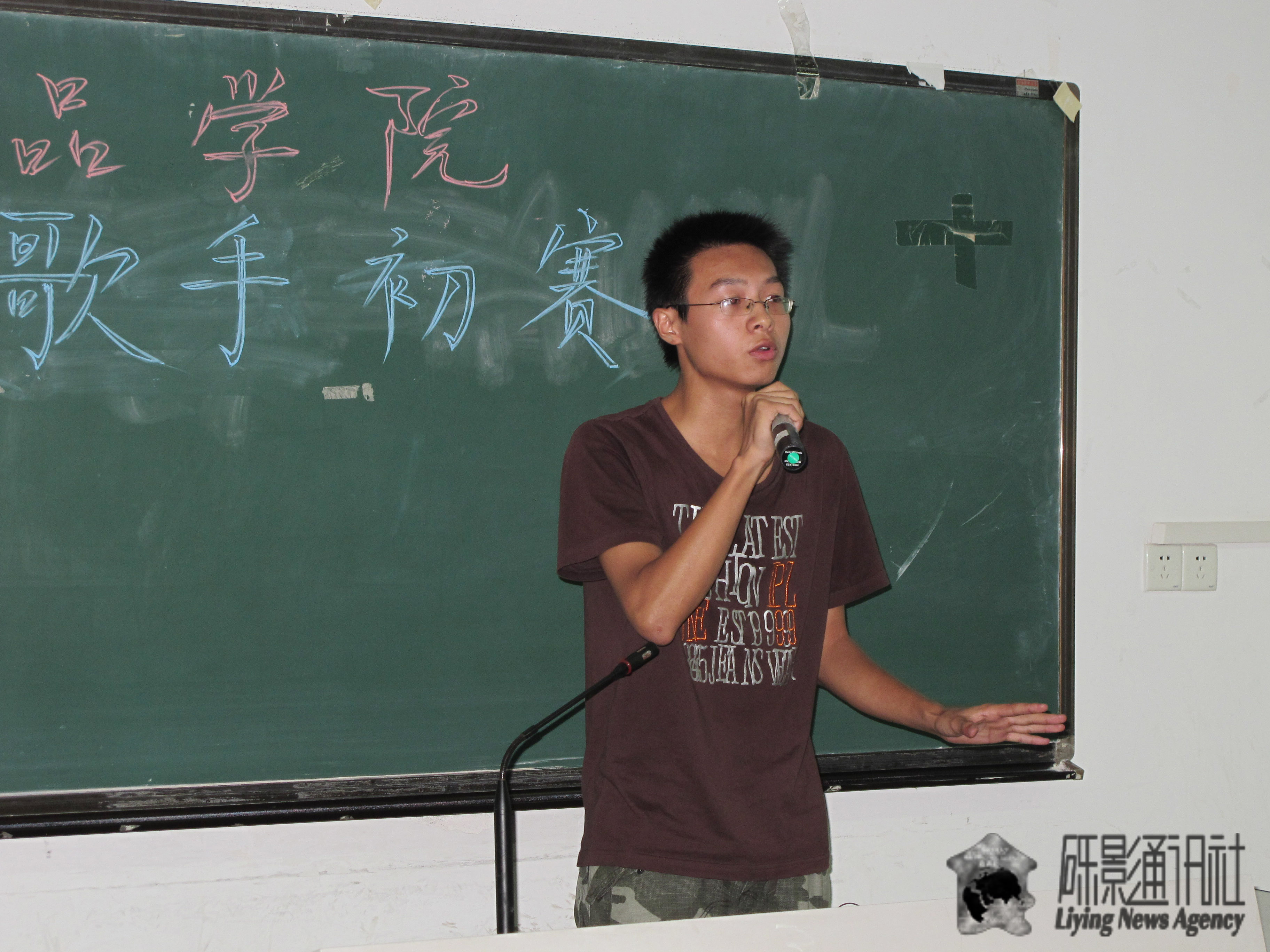 初赛分为中午和晚上两个时段进行,每位参赛者须清唱指定的和自选的两首歌曲,每首歌曲不得超过一分半钟。虽然没有音乐伴奏,但参赛者清澈的嗓音和真实的表现却赢得了观众热烈的掌声。短暂的三分钟里,每位参赛者都尽情地展示自己的歌喉,清脆的、低沉的、甜美的、中气十足的……演唱曲目除了流行乐曲,也不乏经典的老歌和自创的歌曲,如09级食品科学与工程4班的廖文豪给大家献上了自创班歌《when you fly》。虽然也有参赛者因为紧张忘词,但他们的勇气是可嘉的,有的潇洒地说:“重在参与嘛!”