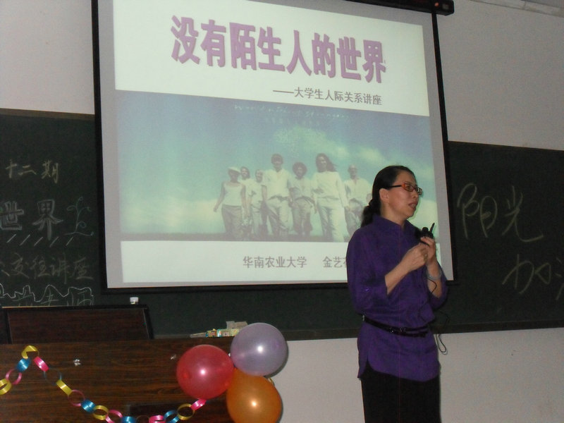 11月4号晚7点30分,食品学院阳光心灵工作坊第12期“没有陌生人的世界——大学生人际关系讲座”在第四教学楼503举行。校心理辅导中心金艺花副教授从人际关系相关理论、如何建立人际关系和处理宿舍及恋人间的关系四方面出发,针对大学生人际关系中存在的问题为同学们指点迷津。