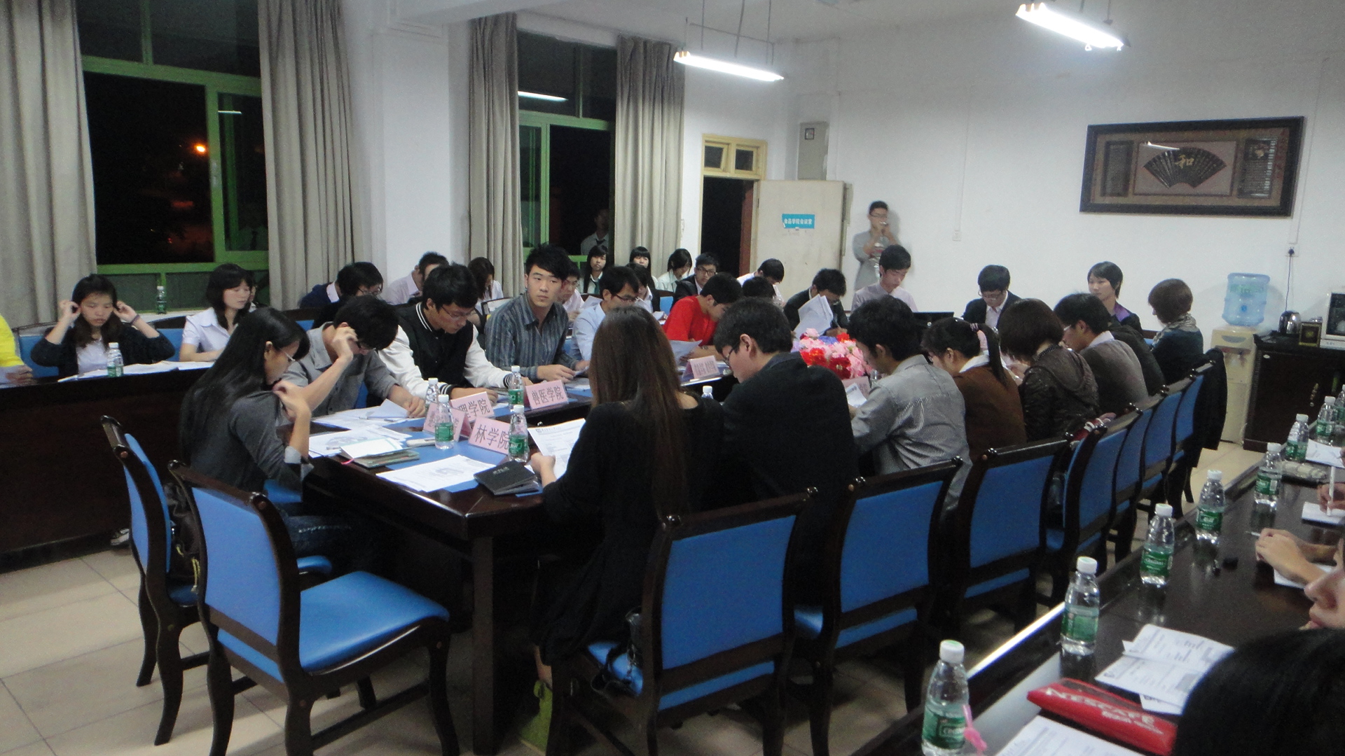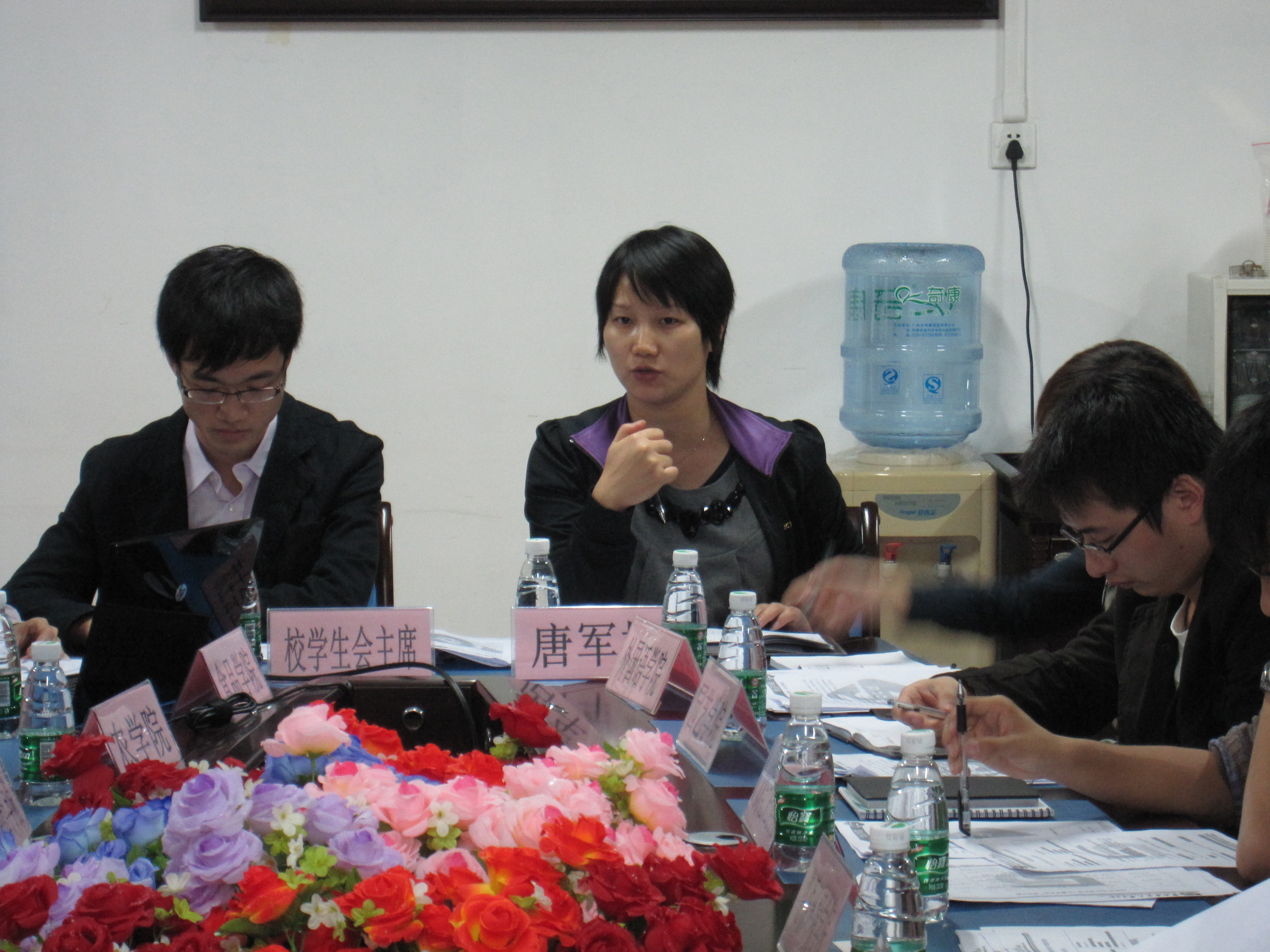 本次主席例会在我院学生会近期精彩的工作视频及优美的音乐声中开始。我院学生会主席黄智立同学作为例会主持人简单地介绍与会人员、会议内容及学院概况后,唐军梅老师发言。唐老师指出,本次会议为各学院提供了一个很好的交流机会。她还对各学院对我院学生工作及本次例会的支持表示感谢,并祝愿有一个愉快有益的例会。校学生会主席尹然平同学简单介绍广东省学联第十次代表大会的宣传活动,各学院简单地回顾近期的工作。随后,会议进入例会的重要环节——讨论评选红旗学生会的修改细则。主席们本着为学生工作的原则,秉承评选红旗学生会的目标,各抒己见,提出许多有待解决的问题。会议讨论气氛十分活跃。虽然有些问题仍未能确定,但细则的大方向——评选内容的比例问题已经确定,并提高校学生会及各学院对此次评选的关注度和参与度。