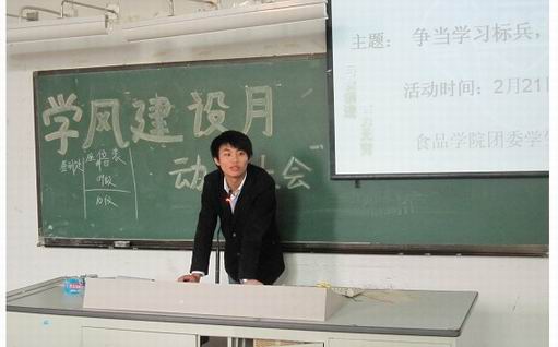 2月25日中午,学风建设月动员大会在院楼314室召开。会议上,辅导员邓果果老师提出了对学风建设的展望,要求同学们遵守考勤制度、纪检条例、课堂纪律,坚决杜绝考试作弊现象。他还强调了学习的重要性,鼓励同学们参加各种竞赛及各种科技创新比赛,发表课题论文,并让09级同学认真做好英语四六级考试复习。