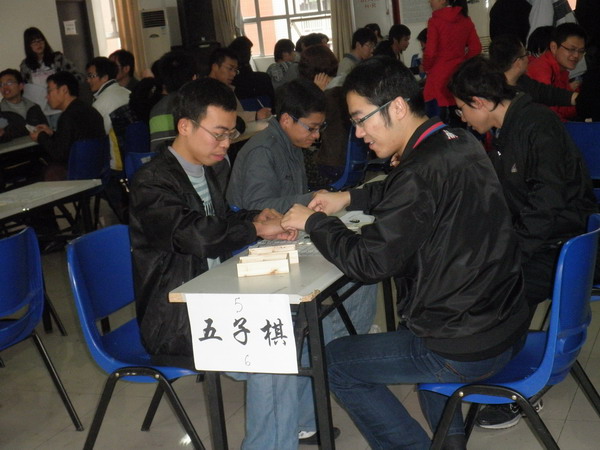 经过上午两个多小时的激战,参赛者经过初赛、复赛,最终进入决赛。其中,跳棋项目在上午圆满结束。下午比赛从2点半开始,各裁判各尽其职,选手们尽情发挥以展现自我,现场气氛十分很热烈。最终,我院选手韩笑同学凭借强大的实力,一路过关斩将,杀进五子棋决赛,最终获得第二名佳绩。