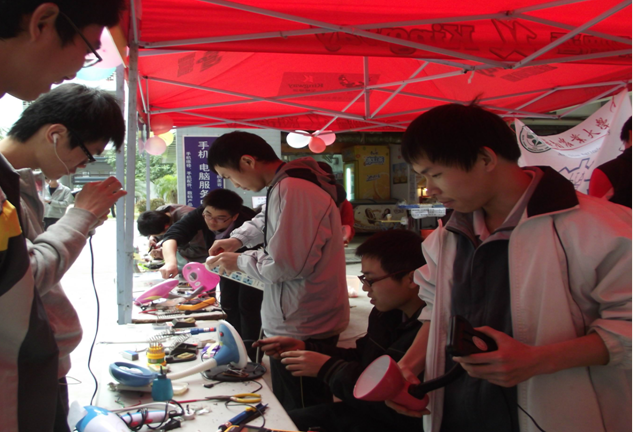 在活动当天,醒目的标题“爱心维修活动”吸引了不少同学带着小电器前来咨询。权益部的同学耐心解答有关权益的问题,派发权益知识和电器保养常识单,有序地登记维修的小电器并适当进行分类。工程学院团委实践部电器维修服务队的同学尽其所能认真地修理小电器。随着时间一分一秒地过去,前来维修电器的同学越来越多,场面如火如荼。