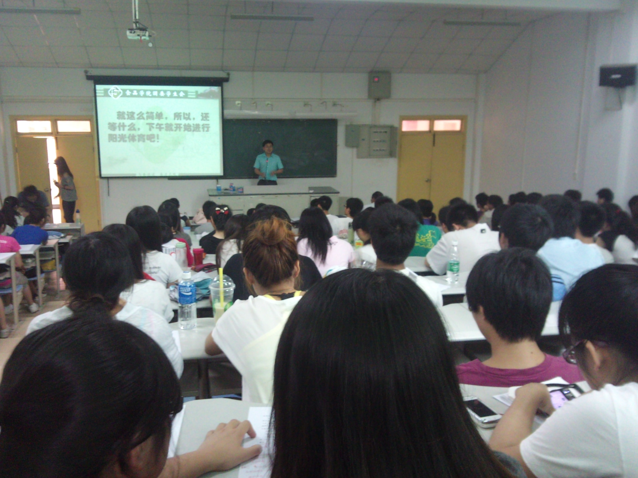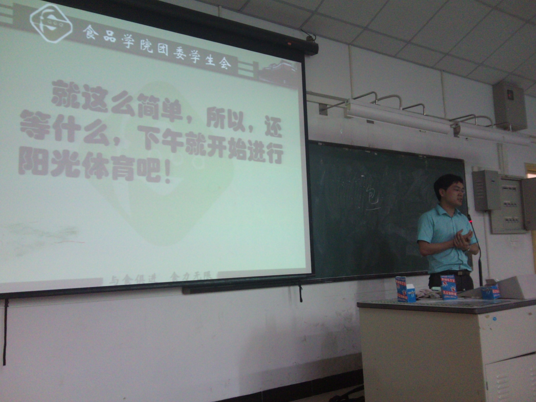 食品学院于5月20日召开了一次为贯彻落实阳光体育的动员大会,有团委书记鲍金勇老师,体育部指导老师王老师,专门负责阳光体育的包老师出席会议,就阳光体育相关问题对各班班长,团支书,体委进行宣讲和答疑。会后,同学们阳光体育的核心有了深刻的理解——组织发动学生参加体育锻炼,增强学生身体健康水平。同学们也明白了如何正确上传资料和照片。希望同学们尽快行动起来,让体育运动深入人心,全民健身一起来。