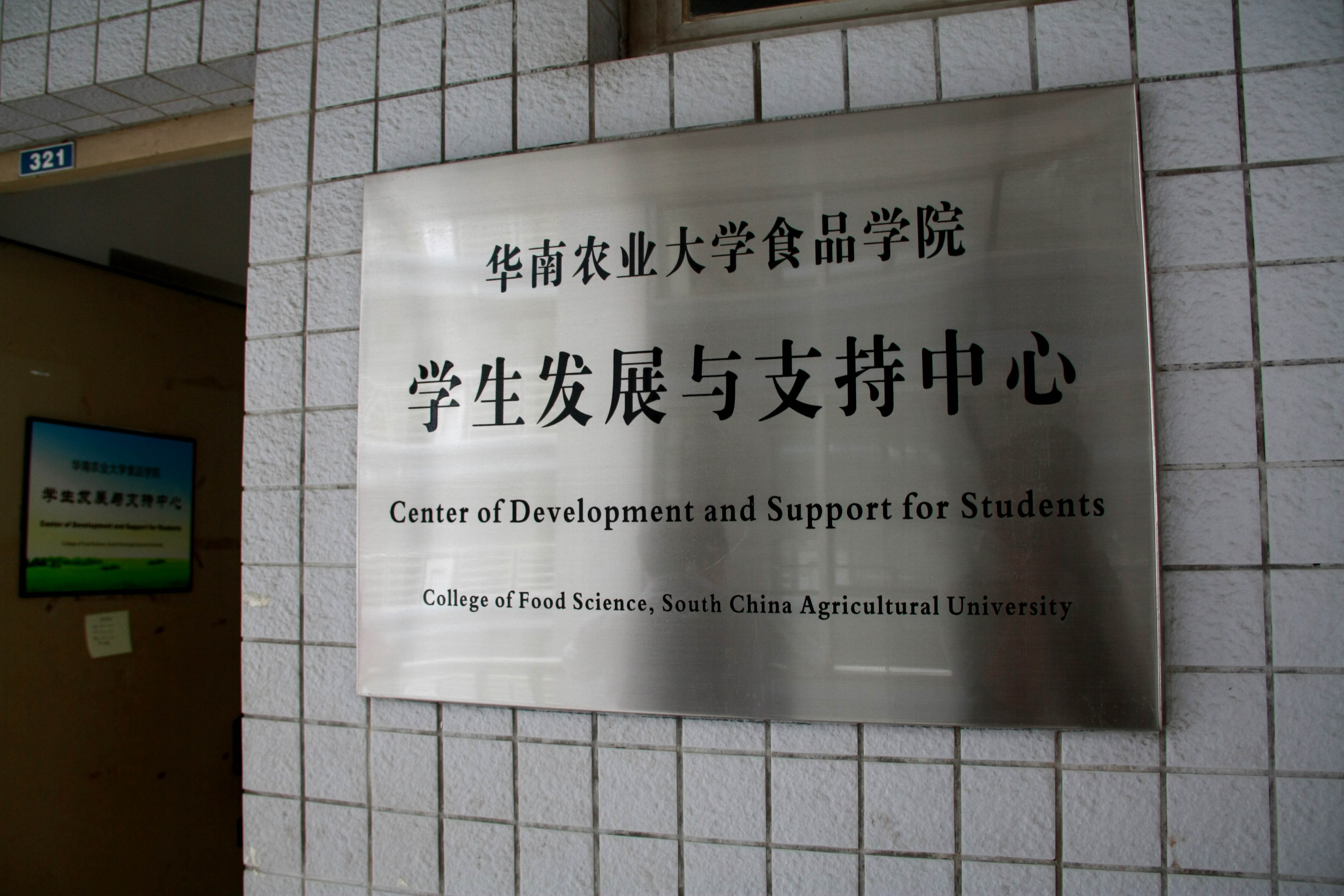酷暑炎炎,校启林南区33栋321室里冷气开放,还有饮水机提供方便的纯净水,几位新生家长在木沙发上与一位老师相谈正欢,坐在办公桌前的老师正在接待一名满脸困惑的新生,另有几名新生手执通知书和各种文件坐在一旁等候。走出这间办公室,看到门外的匾额上书,“华南农业大学食品学院学生发展与支持中心”。