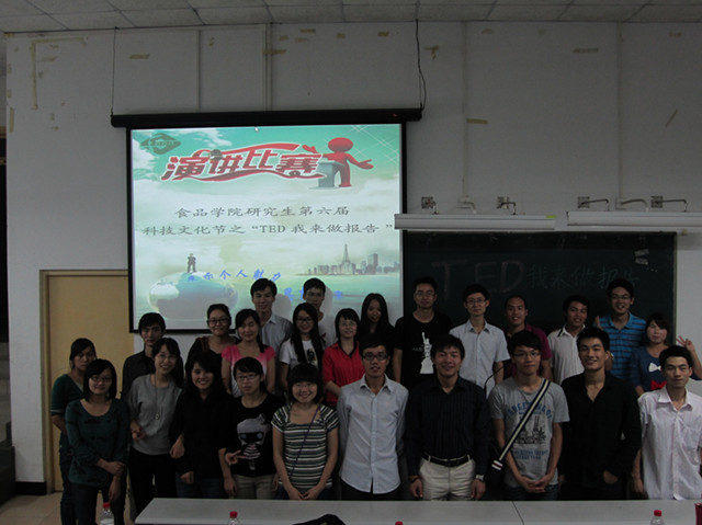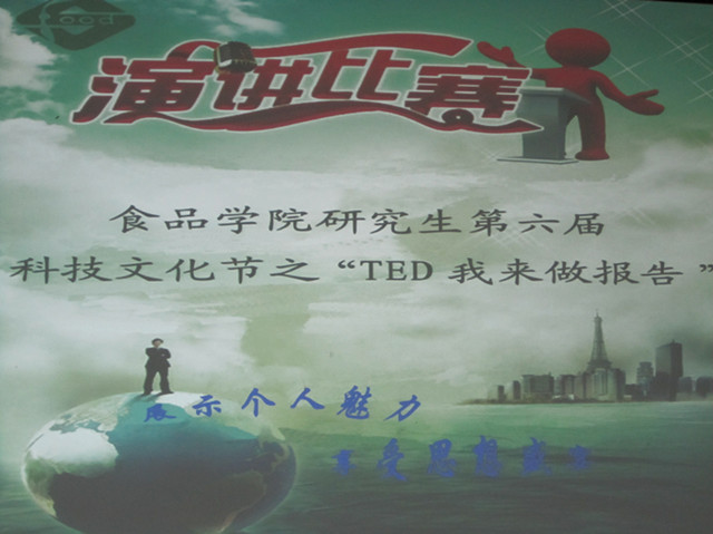 11月3日19:00食品学院研究生第六届科技文化节之“TED我来做报告”演讲比赛在食品学院院楼举行。本次比赛邀请到校研会副主席狄飞达、校研会常委黄娟华、刘斌以及食品学院研会主席臧帅、团委副书记谈娜、副主席刘莉、缪丽华以及研会各部长作为评审嘉宾。
