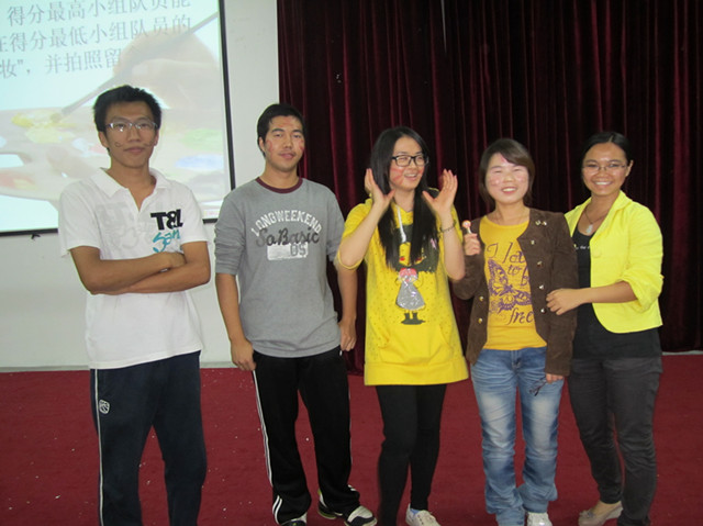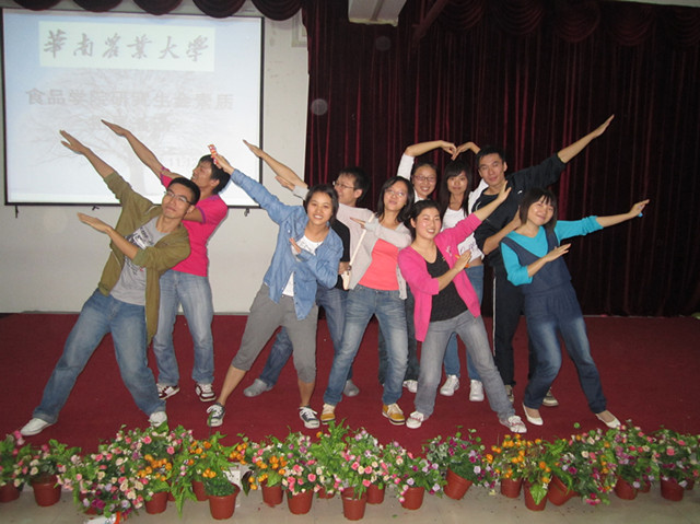 在活动中通过抽签分成了四队,各队分别选出队长并取了响亮的名字即“低调豪华队”、“翠花队”、“同心队”、“威武队”,同时喊出了各自的口号。活动首先进行的是全体参与的暖场活动,即“一块五毛”的游戏,男生是一块钱,女生是五毛钱,同学们自由组合成主持人喊出的钱数,组成钱数不够的和落单的同学被惩罚。然后进入了活动的主要环节,在第二环节里有四个游戏分别是“解手链”、“夹传气球”、“神龙取水”和“王者游戏”。各个队通过完成游戏的名次获得积分,依次为10、8、6、4分。在“王者游戏”环节“低调豪华队积4分被罚学3种芙蓉姐姐的S型身材,他们滑稽的动作让同学们笑声连连。在轻松愉快的氛围下游戏结束了,以“翠花上酸菜”为口号的“翠花队”获得了冠军。在颁奖仪式上得分最高的“翠花队”成员为得分最少的“威武队”成员化妆把活动推向了高潮,“威武队”成员被染成了各种花猫,然后研会所有成员合影留念,据此食品学院研究生素质拓展活动圆满结束。
