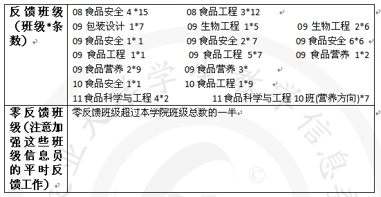 反馈质量较好的班级有:09食品工程5、09食品营养3、09食品安全6等班级。