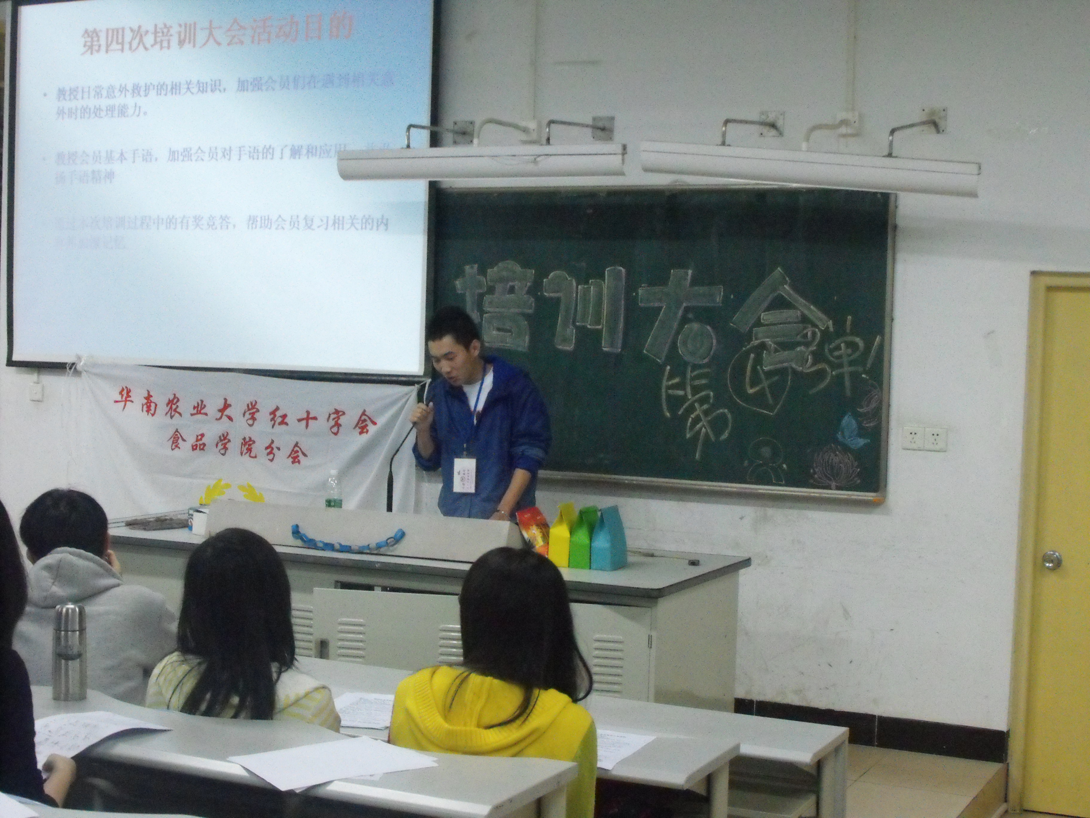 3月4日晚7:30,华南农业大学食品学院红十字会第四次会员培训大会,准时在食品学院院楼的514课室举行。食品红会的会员参加了此次培训大会。