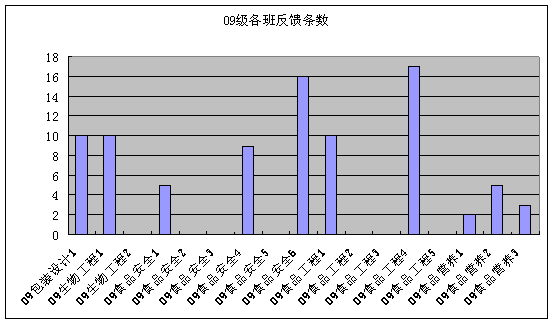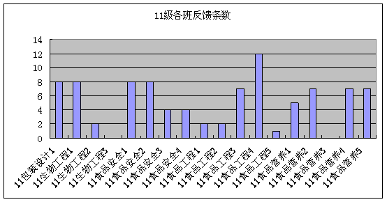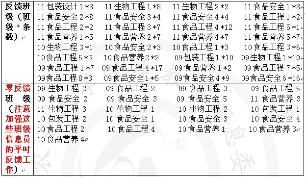 反馈质量较好的班级有10食品工程3班,11包装设计1班,11生物工程1班,11食品安全1班,11食品安全2班,11食品工程2班,09食品工程4班,09食品安全6班,09生物工程1班。