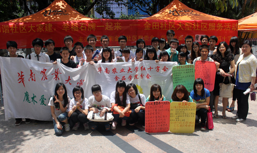 4月22日上午,华南农业大学食品学院红十字会,艺术学院红十字会、农学院红十字会、魔术协会、创意协会、食品科普团在天河区人民政府石牌街道办事处、金田小区居民委员会的支持下,在龙口西路开展了“温馨服务暖社区,薪火相传华农情”的社区服务活动。免费按摩烧艾、趣味游戏、魔术表演、食品安全知识介绍等活动,得到了当地社区的民众的热烈欢迎和积极参与。