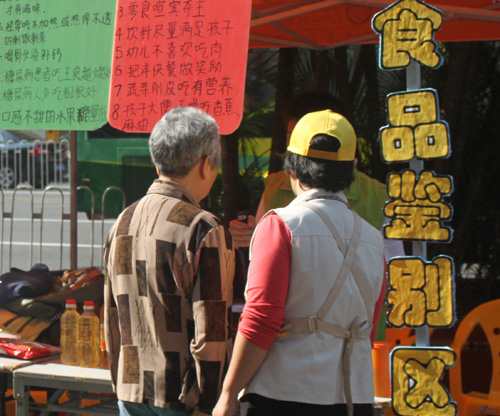 “大妈您看,买油的时候您先拿两瓶油使劲摇几下,然后观察它里面的气泡,如果某一瓶气泡多而且很均匀的话,那就说明这瓶油是没过期而且质量比较好的……”食品科普团的摊位前的志愿者正认真热情地为来咨询的小区居民讲解,并实际操作如何辨别食用油的小技巧。此外,如选酱油要选摇了之后泡沫较多的;饮用牛奶的误区及食品标签误区等相关的食品小知识也吸引不少居民。
