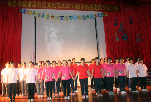 美妙的声线,激动的旋律。10级的同学们,展现出各自的才华,通过自创、改编、串烧等形式,从众多的青春歌曲中,打造了一首又一首充满了各自的回忆和温馨的班歌。生工2班一首《倔强》告诉了我们飞扬的青春;食工7班《we are young》的格子风、多变的走位和舞蹈让人眼前一亮;食工8班以一曲《八爪鱼相亲相爱》串烧歌曲表现了青春的可爱;包工1班原创的《紫荆花又开》还原了青春曾经的美好;食工6班打出了吸引眼球的“伪娘风”;食安1班推出了饶舌的RAP;食工9班改编的《流连在食工班的时光》还原了一个真实的曾经;还有包工2班捧着蜡烛的温馨感恩演唱《因为爱在心中》等等。