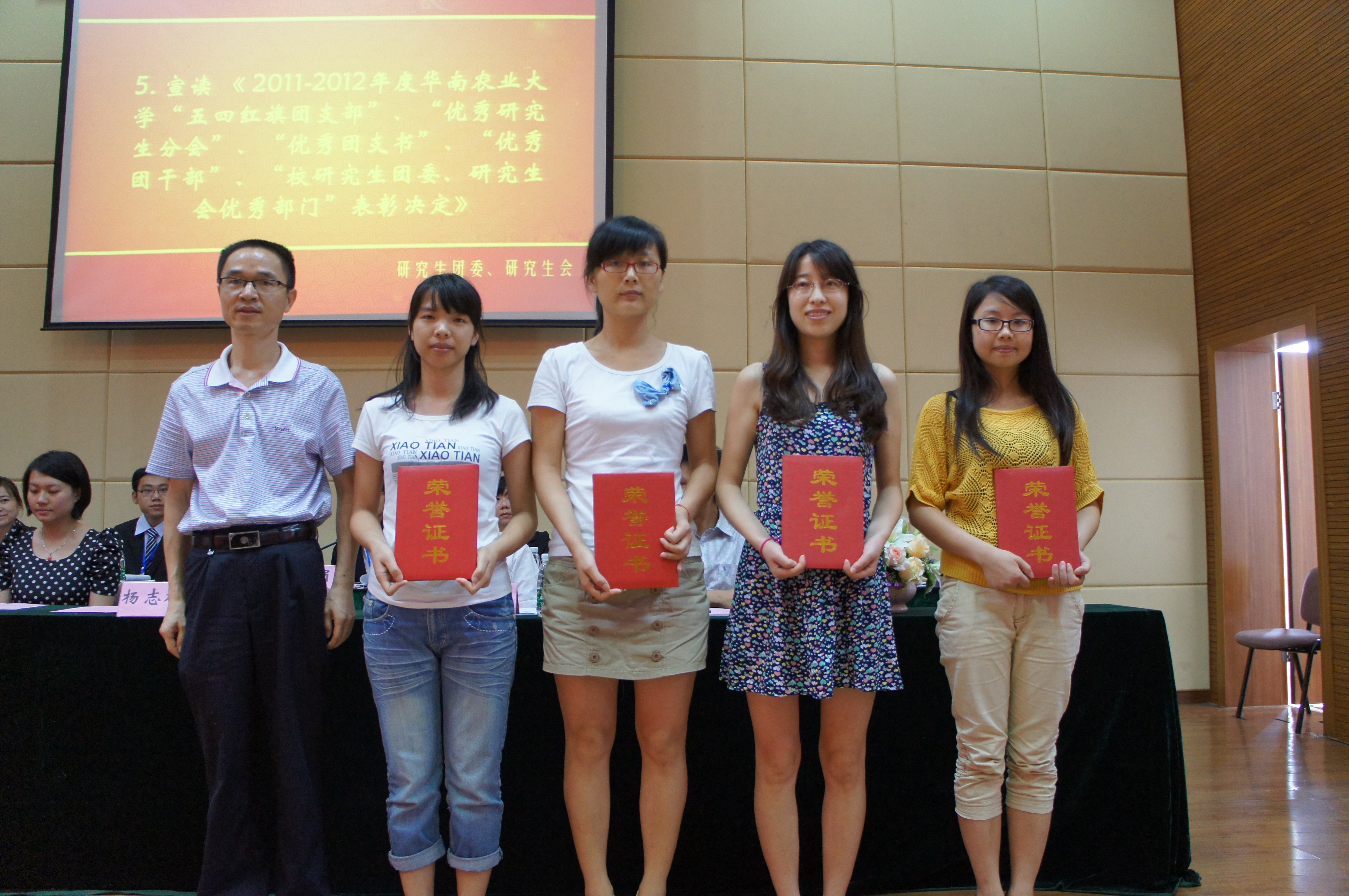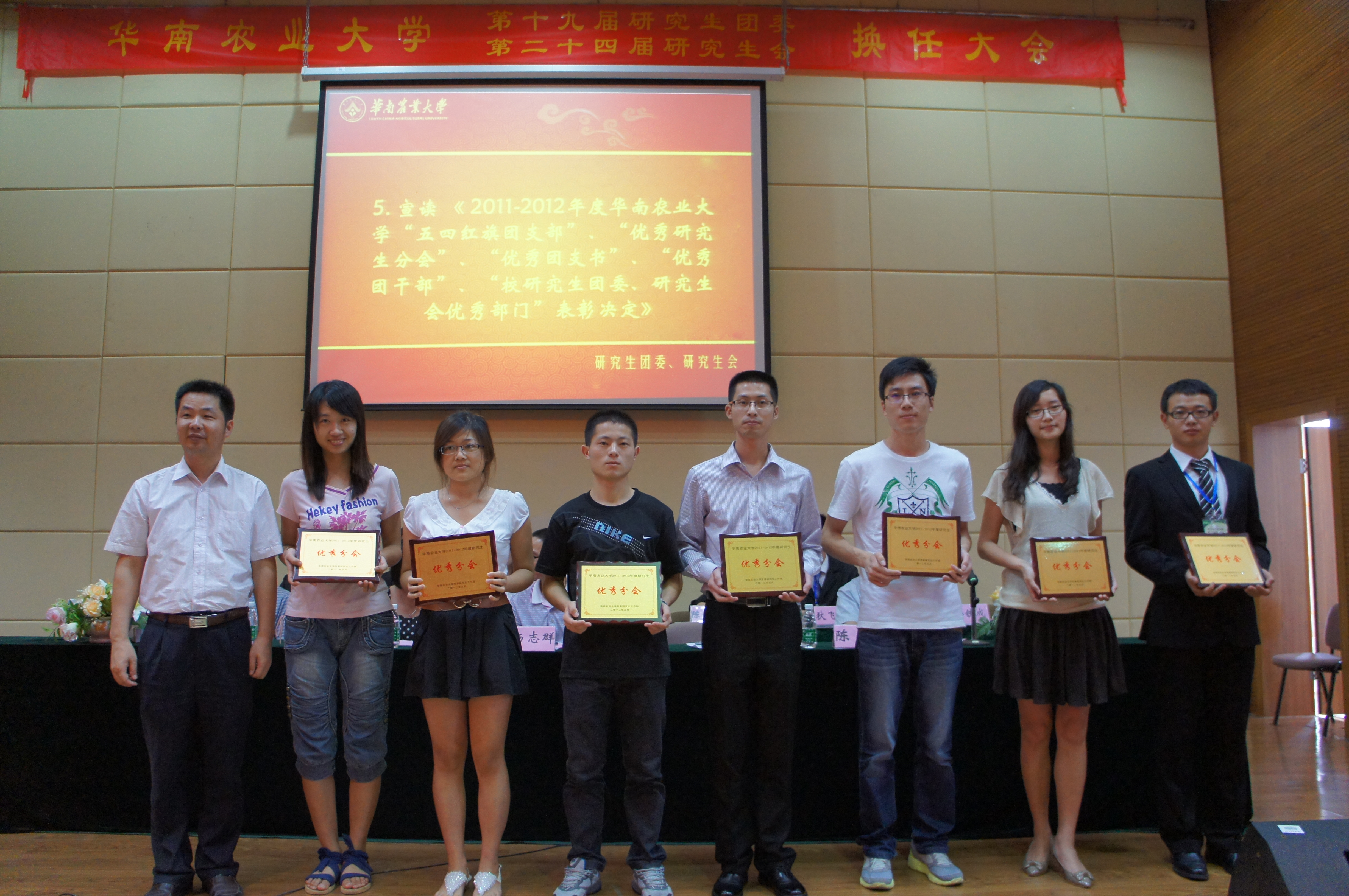 2012年5月10日下午三点,第十九次研究生团员代表大会、第二十四次研究生换任大会在园艺学院报告厅举行。食品学院研究生团总支和研究生会分别获得了“五四红旗团支部”和“优秀研究生分会”的荣誉称号。