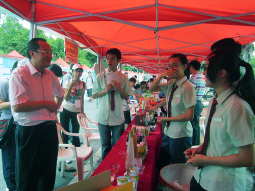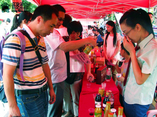 今晨,行政楼前人流络绎不绝,各学院摆出各自具有特色的“产品”,我院也打出自己的特色产品,如华农酸奶、桑枣汁、青梅酒、羊奶粉等一些食品和其它一些食品包装的设计。同时也设立了试饮区,供行人品尝,吸引参观人员的关注。我院提前对相关人员进行了培训,向来访的学弟学妹们和家长们进行介绍产品信息,其中包含的相关专业的介绍和志愿填报的指导。