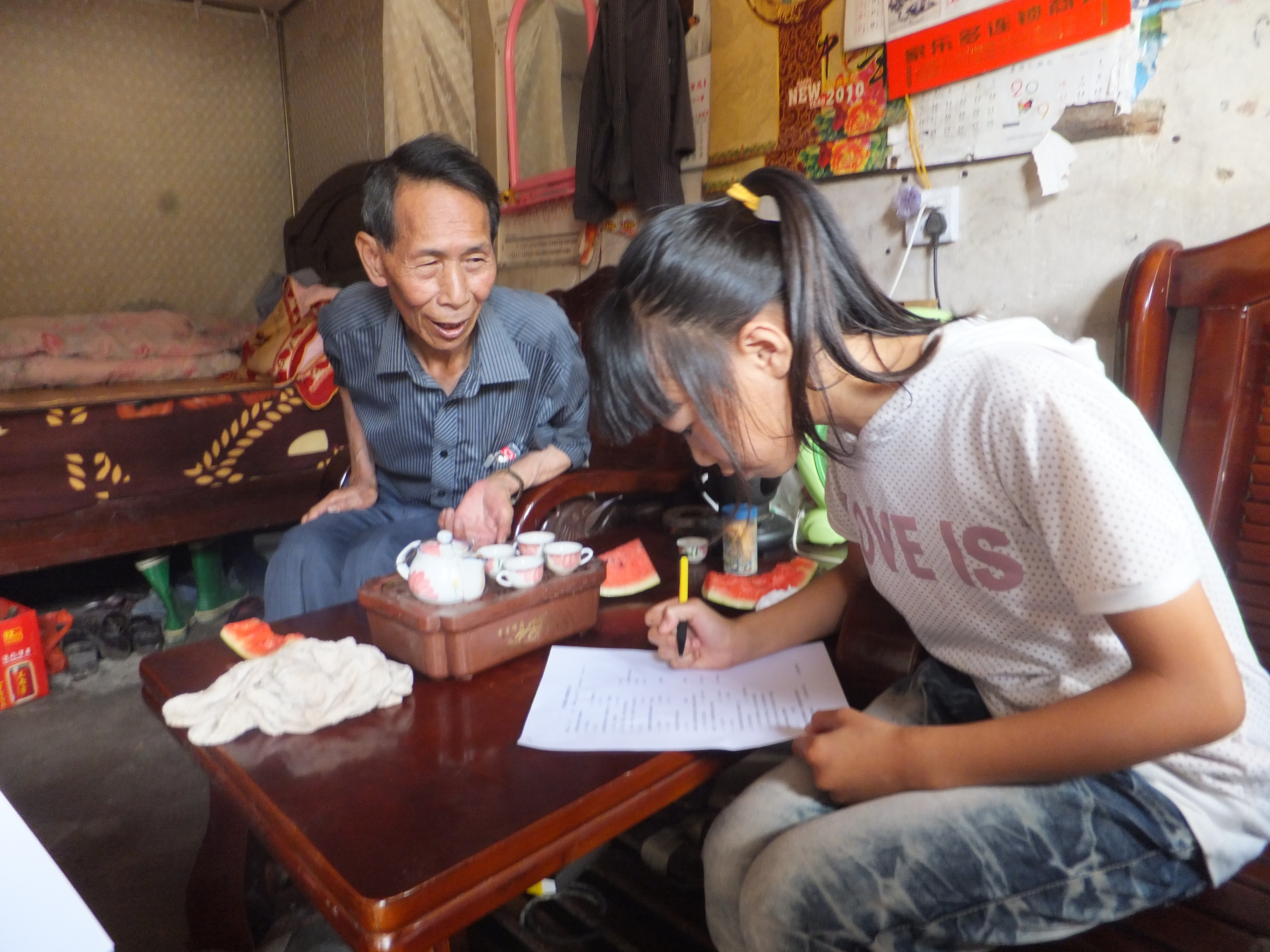 调研组走进一间围龙屋,一位高中生模样的男生陪着老奶奶。经队员了解,原来今天是阿婆生日。队员们配合阿婆填完问卷后,经阿婆同意给她唱起《生日快乐歌》。阿婆显得有点紧张,但喜悦的表情溢于言表。队员林清娜、张丽英送出亲手做的折纸礼物,祝福她生日快乐,健康长寿。