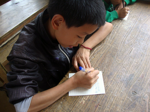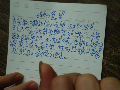 随后,进入这节心理课的重点部分。支教队员让学生们在纸上写下心中的梦想,在课堂结束后将这些纸条装入盒子中,转交给当地的老师,借此来让学生们能够记住自己的梦想,日后能够借助这些写有梦想的纸条给孩子们进行适当的教育。学生们的梦想都很特别。“到美国留学,写一本自己的观察录;希望全家健健康康,生活安定快乐;这个农村不再裸露、丑陋。”这是三年级陈雨心中的梦想,还有四年级邓小敏的梦想是长大以后有份安稳的生活,让爸妈过上好日子。