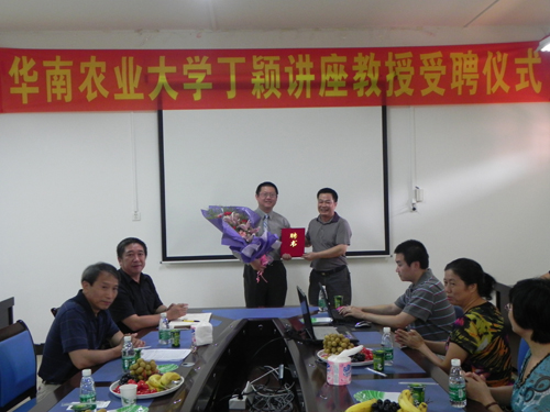 8月9日下午4点, 美国罗格斯大学黄庆荣教授受聘我校“丁颖讲座教授”仪式在食品学院301会议室举行。我校党委副书记钟仰进、人事处处长苏雄武、食品学院院长孙远明、副院长黄苇、食品科学系主任曹庸及部分师生代表出席了受聘仪式,受聘仪式由孙院长主持。