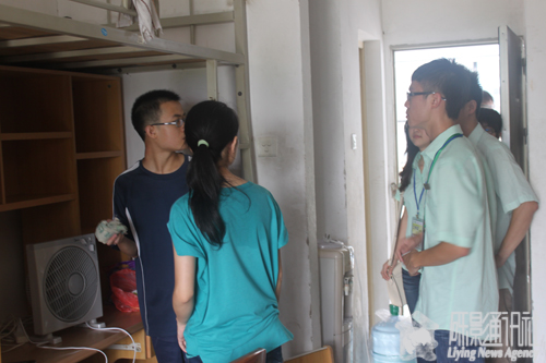 在中午时分,天公不作美,下起了滂沱大雨,让仍在报到点的新生陷入困境。志愿者和阳光员助班们果断将新生转移至附近宿舍楼内以及其他场所避雨,交代了相关事宜后又冲入了暴雨中继续忙碌。而在大本营的人员则利索地收拾好新生资料,归置在远离雨水的地方。还没来得及转移的新生,在志愿者们雨伞的保护下,暂时安顿在大本营。浑身湿透的志愿者和阳光员助班们,在风雨中陪着新生,自己却未顾得上吃中午饭。风雨过后,他们依旧活跃在新生的迎接工作的第一线,从未退缩。当问起志愿者累不累时,他们笑着说:“累是累啊,但很有意义,想起上一年我们当新生时得到过师兄师姐的帮助,这次的接待工作我们义不容辞。”