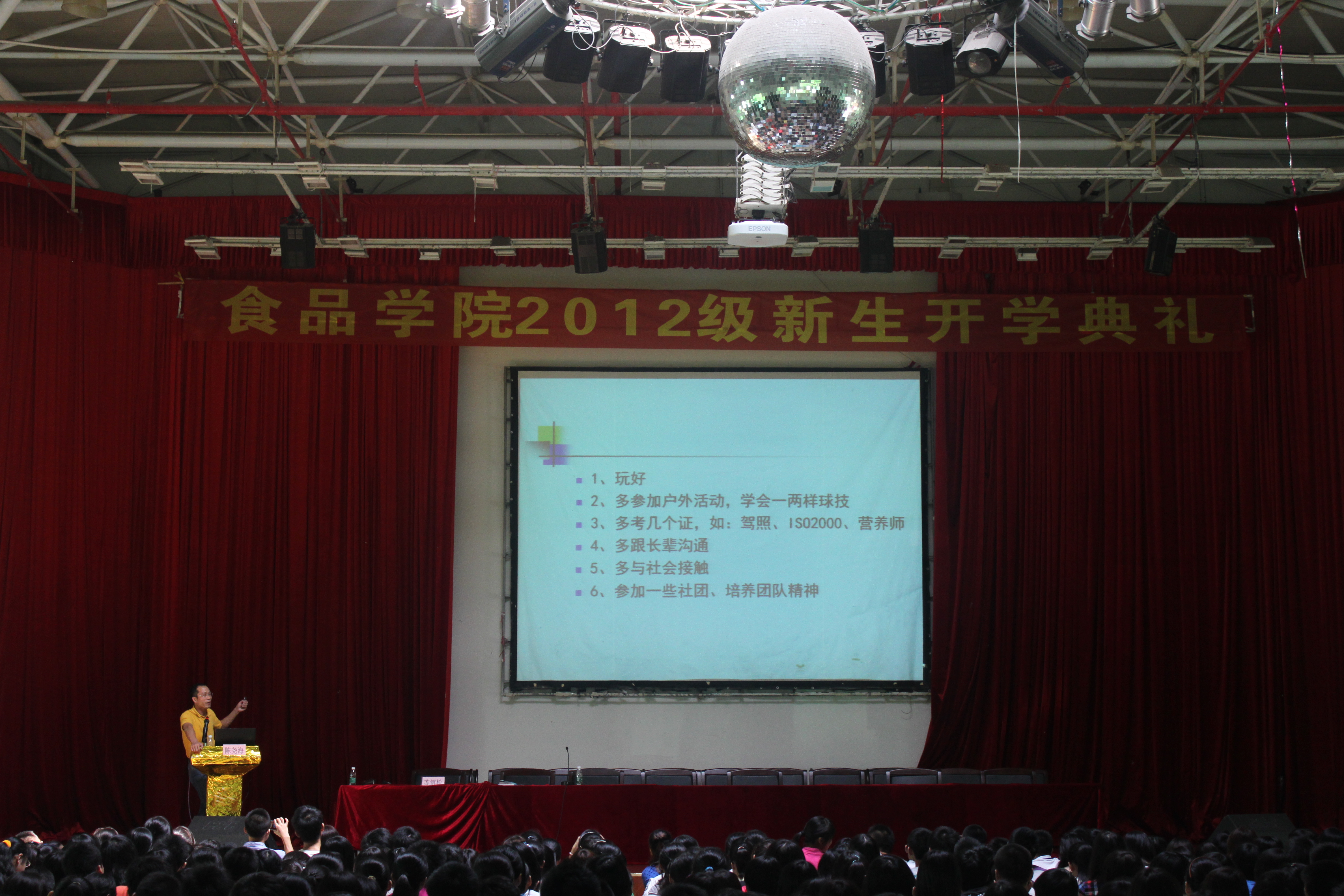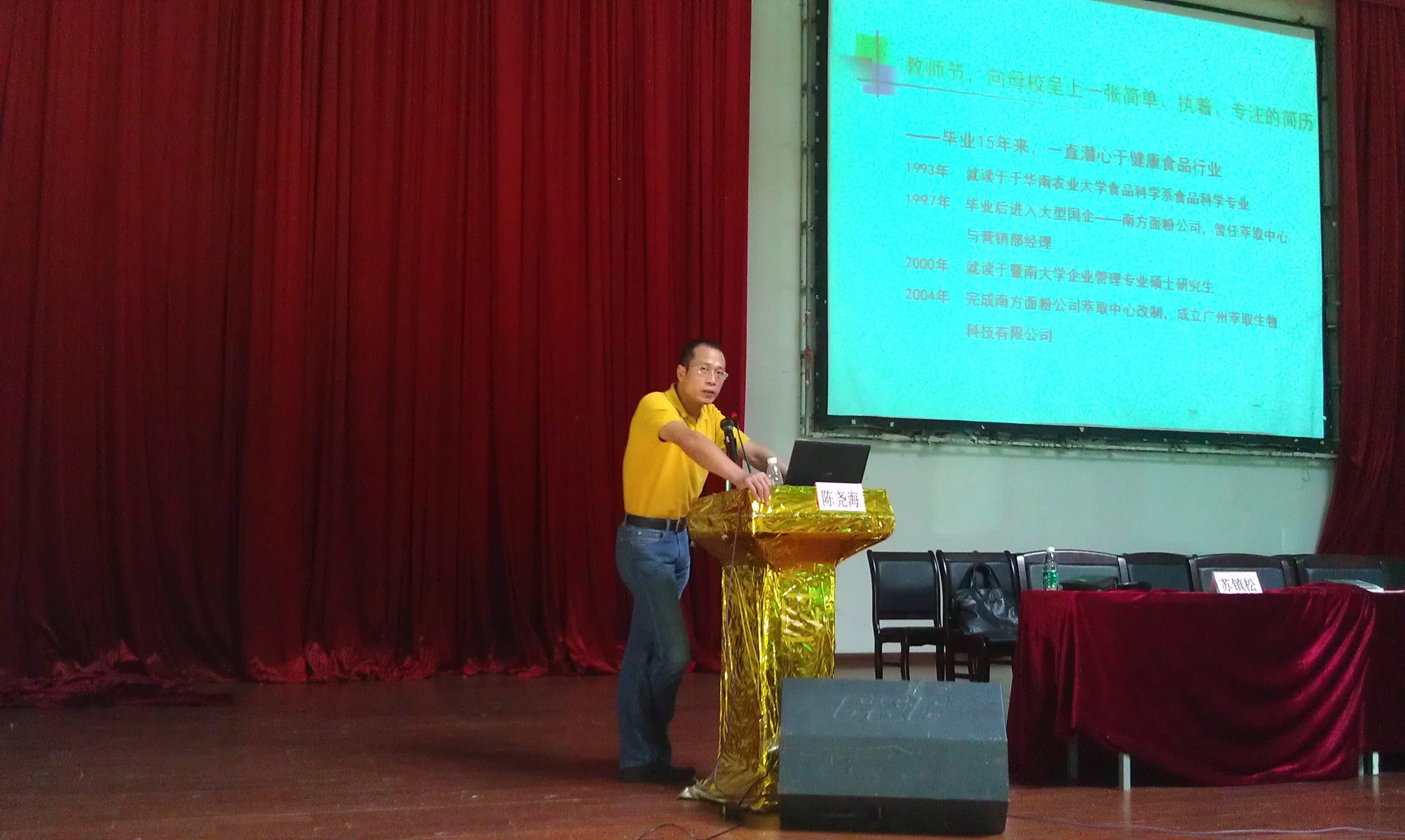 迎新周已进入第四天,食品学院2012级新生对大学校园的适应渐入佳境。为帮助新生更准确地定位自我和了解专业前景,2012年9月11日,食品学院2012级新生有幸邀请到一名“大师兄”-- 食品学院97届校友、现任广州萃取生物科技有限公司董事长兼总经理的陈尧海先生,在华山活动中心共同度过了愉快的分享交流报告会。报告会由党委副书记苏镇松主持。