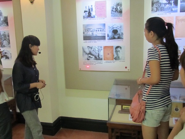 讲解员向同学们介绍学校历史
