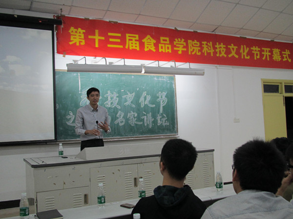 在此开幕式上,田立老师首先介绍了食品学院科技文化节的内容和意义,随后提出了在注重学术建设的同时,也要加强学术道德建设,营造积极健康的学术氛围。之后,有解新安老师主讲名师名家活动之第一场“微乳体系基本原理及应用”,解老师给大家介绍了一个新兴的概念—微乳体系,微乳是体系由水、油、表面活性剂和助表面活性剂按适当比例混和,自发形成的各向同性、透明、热力学稳定的分散体系,随后并对其基本机理、表征及影响因素、应用情况等进行了生动形象的讲解。在讲座中,解老师着重讲了微乳体系关于食品、化工和新工艺开发的应用研究,比如用于调控茶饮料的沉淀和蛋白质的萃取等。解老师不仅给同学们讲解了一些专业知识,也以实例告诉研究生们应具备的科研态度:在做课题的过程中,有个大目标,走好每一步。简洁朴实的总结让同学们深受启发,在讲座临近尾声时,同学们的积极提问和热烈持久的掌声,表明了此次讲座,效果甚好,不仅丰富了同学们的专业知识、拓宽了同学们的研究思路,也成功调动了同学们求知的兴趣。