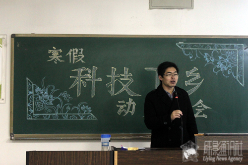 在致辞中,左浪老师衷心感谢了大家对活动的积极参与。他指出,在中国的13亿人口里,有6亿多的农民,我们应当去关注农村,关注农民,关注农业。他引用了五四青年节时温家宝总理在中国农业大学所说的“我们当代青年(大学生)要关注农村”,呼吁各位大学生在大学里至少下一次乡,这对自身成长是很有意义的。其次,对于此次寒假科技下乡,左老师提出三点希望。第一、希望学生利用自身的食品专业与特长,有针对性地开展活动,在过程中得到锻炼,不断进步。第二、希望科技下乡活动给当地农村带来实实在在的帮助。第三、希望同学们能在团队中团结地开展工作,与当地村民保持良好的沟通,不要与当地的民俗风情发生矛盾和争执。