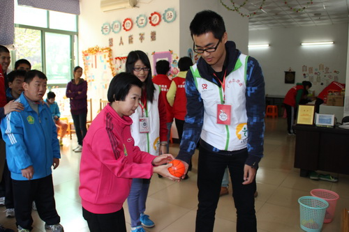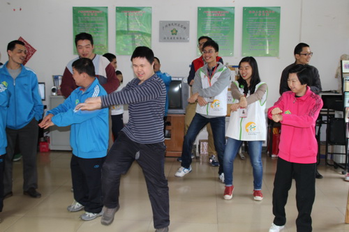 当志愿者们走进宽敞明亮的教室时,二十几个特殊的“孩子”拍起手来热烈欢迎。他们中有的10多岁,也有的40多岁,但智力水平都仅相当于2—3岁的正常儿童。志愿者们很快与这些孩子打成一片,并玩起了“音乐传球”和接抛球等小游戏。志愿者小佳说道:“这些孩子的手脚不太灵活,通过简单的肢体游戏,能让他们锻炼身体,保持身体的协调性。”