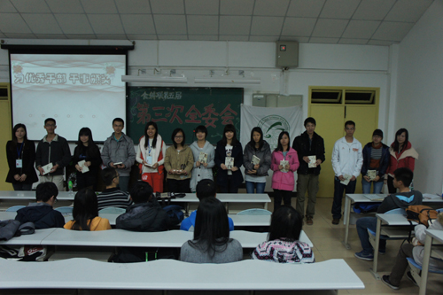 各项目小组负责人上台讲解本小组的工作策划,包括春游方案、启铭讲坛工作、科普团安排和会员大赛的精彩游戏等。各个策划都有各自的亮点,活动方案同比上年有所提高。各项目小组讲解策划书后,由两位副会长作经验介绍,她们以一个过来人的身份,给予干事很多建议和忠告,她们都指出学习还有在社团组织锻炼的重要性。最后进行的是颁奖环节,表彰在上一学期表现突出的干部干事。