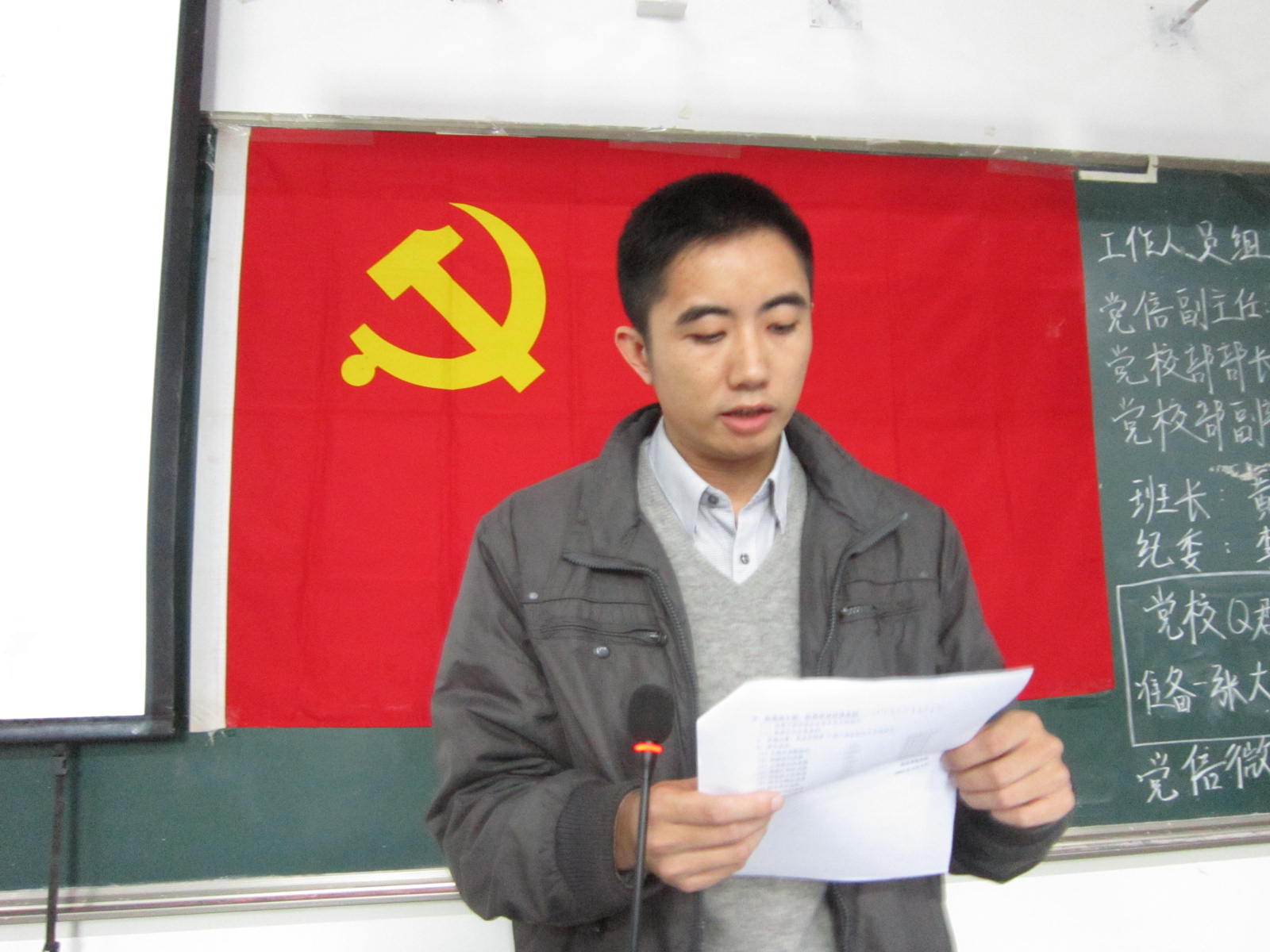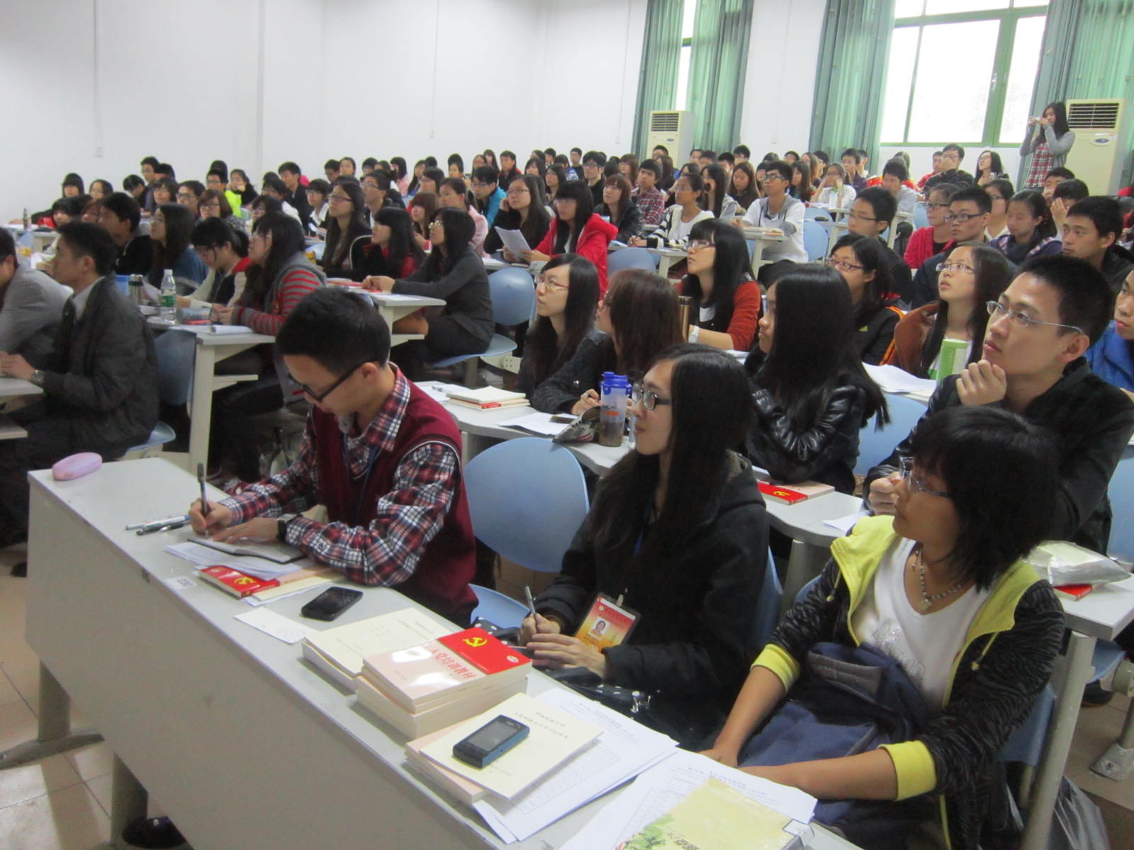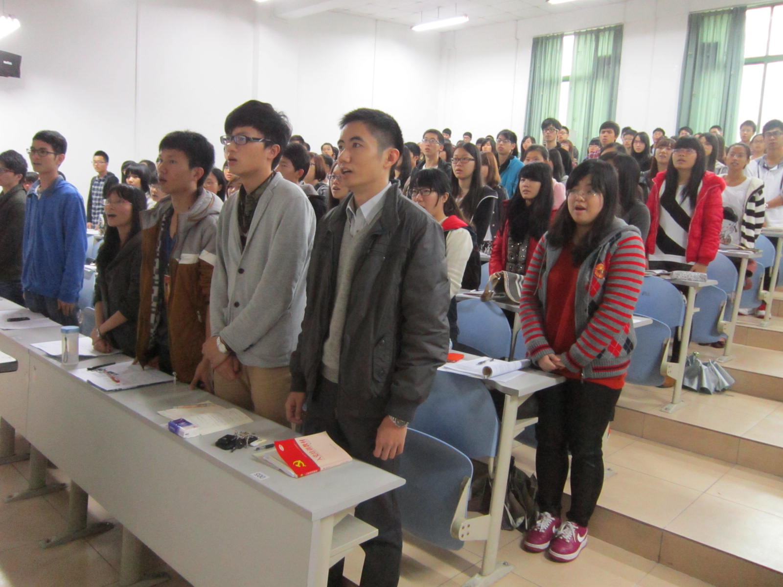 田老师为我们简单介绍了培训的内容、课程安排以及相关的注意事项。他强调了党课的纪律和要求——无故旷课者报学院处理,无故旷课一次者不得结业,无故迟到,早退和无特殊情况请假次数累计3次以上不得结业。与往期党课不同的是,今年会设固定座位,继续严抓考勤情况,以提高培训质量。培训期间,学员的读书心得和思想汇报必须是本人用黑色水笔手写在华农单行信纸上的,学员不得从网上下载照抄,否则不得结业。田老师还着重提出每位学员在党课开课前必须熟唱《国际歌》。