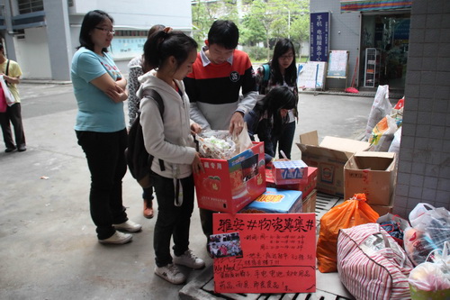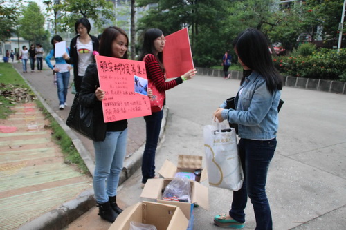 4月20日,四川省雅安市发生7.0级地震,震中芦山县发生数百次余震,灾区人民的生命和财产安全受到严重影响。一方有难,八方支援,为体现大学生高度的社会责任感和无私的奉献精神,以实际行动体现华农学子的爱心,由食品学院团委青年志愿者服务队组织的爱心募捐在启林南社区展开。