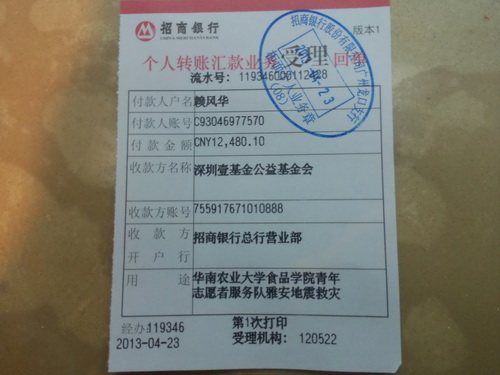 距记者了解,本次所募捐共筹得款项12480.1元,第一时间已全额通过壹基金捐献给雅安灾区的人们。所募集到的物资将会送到广州市天河区五山邮局,通过赈灾包裹、救灾汇款免费服务邮寄到四川雅安,发放到有需要的灾民手上。募捐情况也将通过微博直播的方式向广大同学公开以保证本次募捐的真实性和透明性。(文/图 食品学院 左浪 青志服务队)