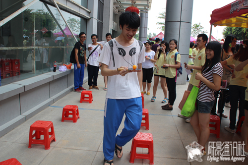 投票区评选激烈的同时,游戏区也笑声洋溢。以两人为单位比拼的心理知识竞答、携带乒乓球穿越障碍、踩报纸等游戏,令现场气氛活跃。