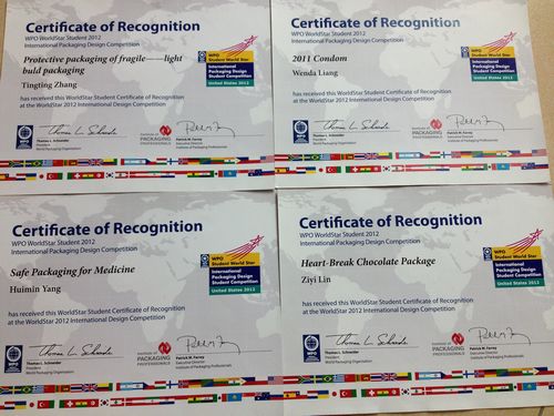据悉,2013年1月,由我校食品学院包装技术与设计专业岳淑丽老师指导选送的4份作品全部获得“证书”Certificates of Recognition奖。2013年3月,世界学生之星颁奖会在美国举行,并发放获奖证书。