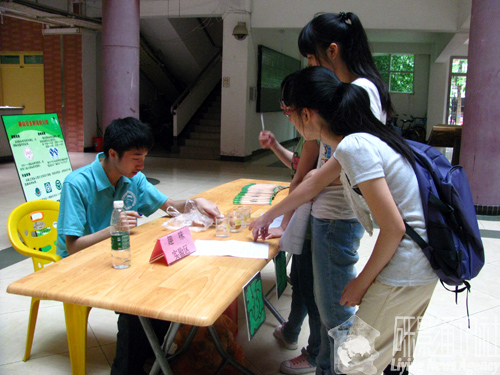 食品学院的摊位由四部分组成,分别是试饮区、展示区、讲解区和咨询区。试饮区提供了由食品学院协助研发的饮品供参观人员免费饮用,在宣传产品的同时增加了人流量。展示区放置了食品质量与安全专业研制的食品检验道具和包装工程专业研发的精致包装,吸引了不少观众的眼球。食品科技联合会负责讲解区,主要是向现场观众传授一些科普知识,另外,在我院院楼也有食科联人的身影,他们向来访的群众展示趣味实验,普及日常鉴别食品好坏的方法。咨询区有各专业老师接受同学和家长的咨询,为他们答疑解惑,让他们进一步了解食品学院。