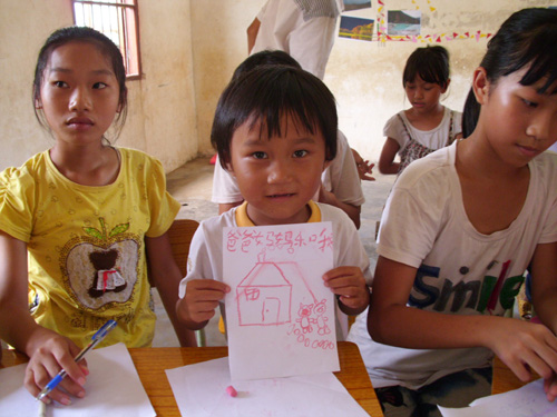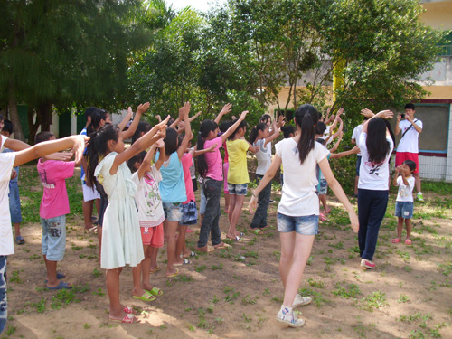 早上的课程是《数字数学课》与《艺术体会与鉴赏课》。队员王卓峰、冯文颖和朱丹宁采用互动式教学,与学生在课堂上一起解答数学问题、欣赏创意设计、学习联想绘画,与学生们共同度过一个充实快乐的上午。两节课之间的空余时间里,老师和学生们也没闲着,抓紧时间学起了体操歌曲《我真的很不错》,在老师的带领下,孩子们很快掌握了动作要领,流利地完成了整套体操。