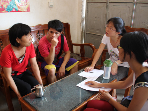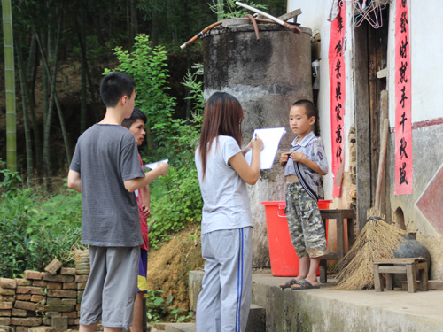 这次的调查中小组拜访了好几户人家,其中最印象深刻的是一个住在山上的孩子。他是蕉湖小学一年级的学生,家里很简陋——没有门,只是用一块大木板挡住房子的入口。他一般和爷爷呆在一起,父母从事农活,早餐不吃,晚餐要等父母回家很晚才可以吃。他很瘦,他真的很瘦,消瘦的身子让队员感到心疼,尤其是在小队准备回学校了,他不放心并带着“晒晒”们穿梭了很多曲折的小路回到学校;田间村民们都在说:“涛涛,你带着你老师们玩啊?”。回校后有队员因此独坐忧伤了好一会儿。