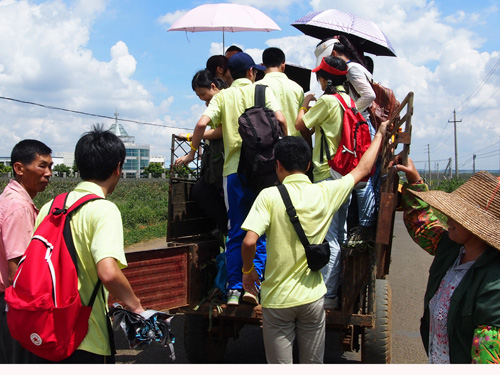 这是今天旅程的小插曲,在到菠萝罐头厂途中,由于位置比较偏僻,队员们顶着烈日徒步走过菠萝田的时候,向周边的开着拖拉机的果农问路,他们热情地说要用拖拉机送队员们一趟,给了队员们一个站在拖拉机上欣赏菠萝田野上慢慢转动的风车的机会。除此以外,回程时,由于居民为乘上公交车争先恐后地拥挤,队员们站在公交车站等了近半个小时,车站负责人过来询问情况后,安排了下一辆公交车线从车站管理厅绕过把队员接上后再乘搭其他居民,着实打动了队员们。