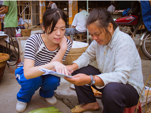 按照事先的安排挂上校旗,贴好自制的爱心宣传海报队伍便开始了宣传工作。队伍兵分三路,分别到各人流密集处派发宣传单并向村民们讲解“如何辨别真假食品”、“如何合理营养搭配一日三餐”等知识。摊位处还设计了小游戏,并准备了小礼品以吸引村民来围观。游戏主要是帮助村民学会如何辨别真假食品,以及认识国家认证的商标。工作一开始进行得并不顺利,有的村民觉得自己是农村的,从来不讲究那么多也能生活得好好的;有的村民则觉得这是在搞推销骗钱,态度并不太友好。虽然受到打击,但队员还是拿出了十二分的耐心继续卖力地向村民们解释掌握这些科学知识的意义和讲解相关知识。队员们的用心,村民们是看得到的,慢慢地,他们与队员间那道冰墙被队员的热情化解了,村民也开始接受宣讲,宣传单派发的速度也慢慢地快了起来。