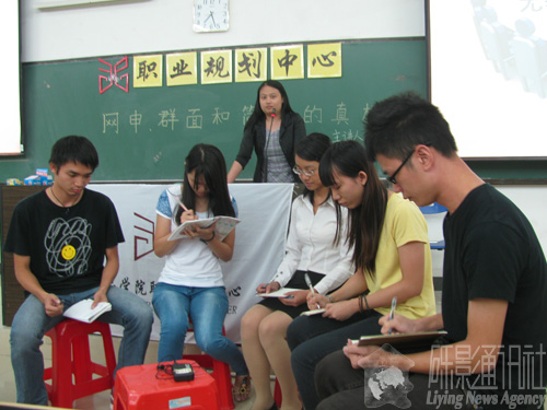 黄立君老师与杨慧琼老师邀请五位在场同学进行管理培训生的模拟群面,在实战演练的过程中,教会同学们要学会推销自己,在任何时候都要先听清楚问题、做足准备后再作答。黄老师说到,同学们最大的缺点在于语言的组织能力不强,一味希望模仿别人,这种不能够被HR记住的人是很难留下的。他强调,在群面中不要讲废话,而是要保持头脑的清醒。能够及时把团队拉回正题的人往往容易被HR留意从而获得机会。