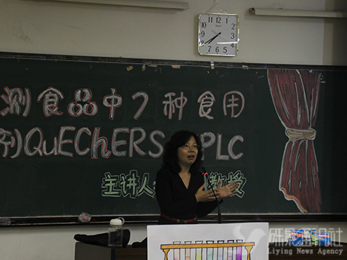 吴副教授一开始就以丰富多彩的生活实例引入合成着色剂这一概念及其使用现状,她以豆干、玉米馒头等例子让同学们更加清楚着色剂超范围使用的概念。在引入比较理论的《食品中合成着色剂的测定》存在的问题时,吴副教授用生动易懂的语言逐步剖析,让在座不管是否对相关内容有所了解的同学都能明白其中的思路。在研究思路这一环节涉及“选择净化剂的依据”时,吴副教授逐一分析每一个净化剂的利弊,并且也在是否可行上给出了详细的原因。随后吴教授也为在座同学详细介绍了研究内容和结果。