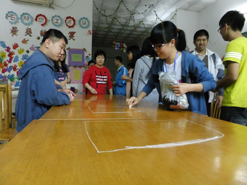 11名工疗站志愿者在红会干事的带领下来到了石牌桥工疗站。虽然离上次志愿活动已经相隔一周,但工友们对志愿者的热情依旧。在互相介绍之后,志愿者们开始对工友们进行手语教学,例如“今天天气真好”,“很高兴认识你”等等。工友们经过学习,积累了一定的手语基础,大家很快就能学以致用了。在志愿者与工友们进行深入沟通环节中,每个人畅谈心声,场面十分温馨。志愿者协助工友用纸条写下自己的愿望并把写好的纸条折成一颗颗愿望星。到了下一个环节,工友们要拿着自己折好的星星站在指定的位置,将星星投到规定的地方。而投中的工友则有奖励。在游戏过程中,大家都越战越勇,现场气氛相当活跃。