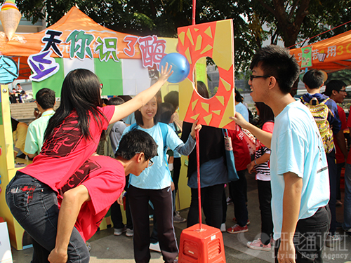 “我们这里游戏刺激,奖品丰富,大家快来玩啊”,“走过路过,千万不要错过”。同学们热情地邀请游客到自己班级的摊位玩游戏、学知识。“速度与吹水”、“你说我猜”、“百圈百中”等创意游戏区挤满了游客,游客们个个摩拳擦掌,跃跃欲试。
