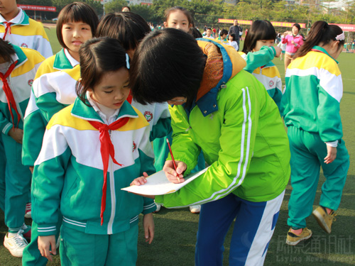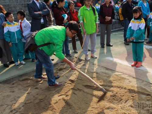 志愿者在运动会还未开始前就将场地布置好,并积极与附小校方沟通,学习使用发令枪等。志愿者按比赛项目分成小组,耐心告诉小学生比赛的规则,仔细回答家长的疑问,认真进行比赛成绩的测量、记录和维持秩序。赛后,记者采访志愿者了解到:“虽然小学生可能会有点调皮,但看到他们稚嫩的脸庞就好像看到了以前的自己,希望他们蓬勃的朝气能被好好珍惜。”