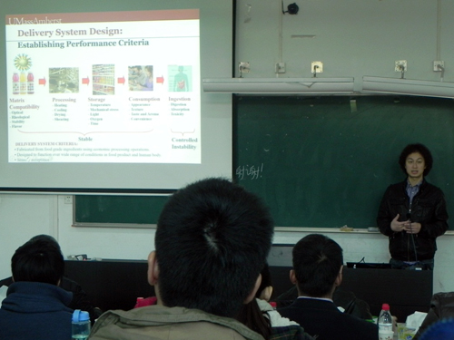 12月24日上午,受食品学院教授曹庸邀请,美国马萨诸塞大学食品科学系肖航教授在食品学院院楼514室作了题为 Nanoemulsionbased delivery systems for nutraceuticals的主题报告。学院党委书记秦亮生出席报告会。