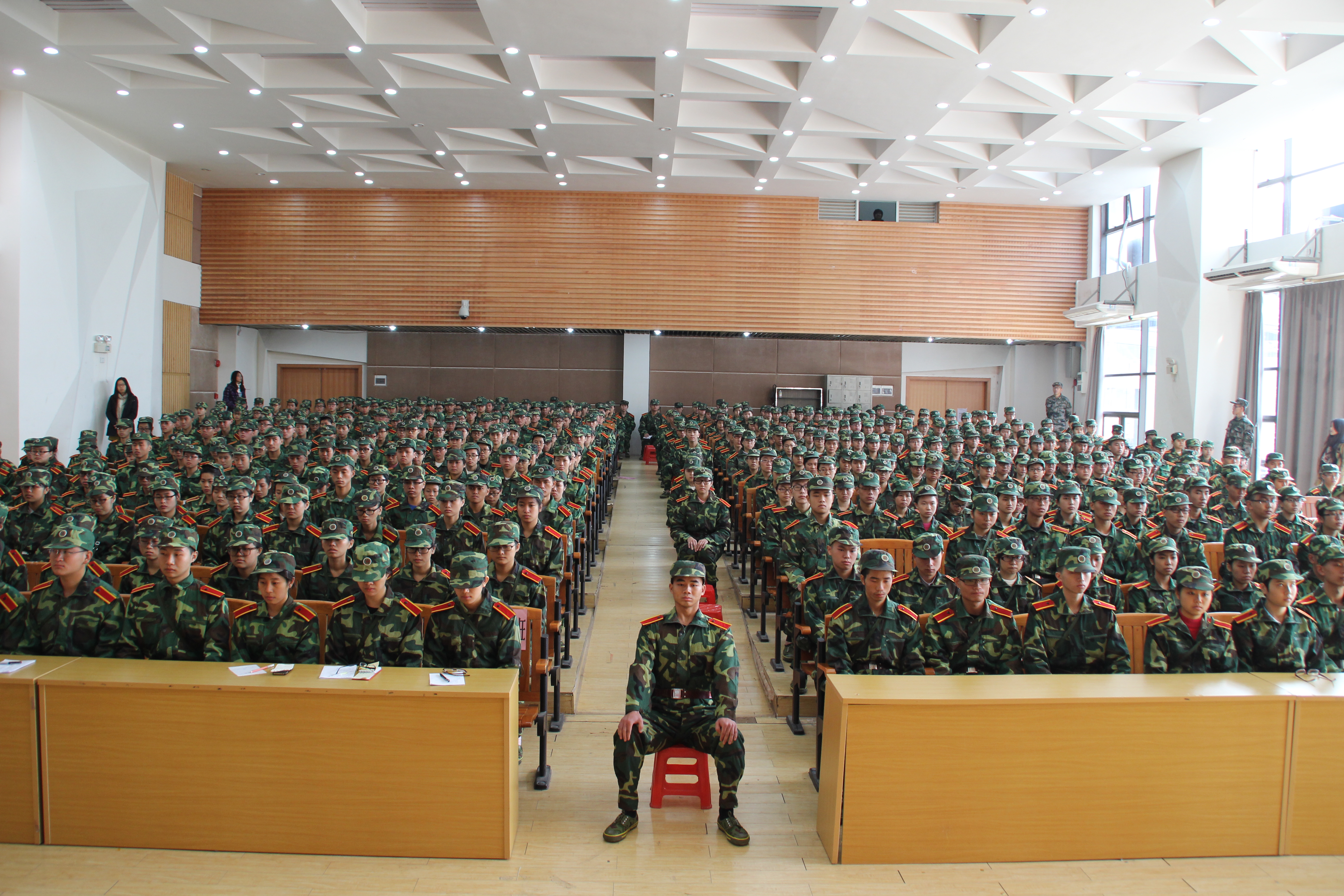 “不害怕,不逃避,不抱怨,不抛弃,不放弃,我们是食品三团八营”,在教导员陈巍的号召下,响亮的口号声萦绕着整个学生活动中心,顿时气势如虹。在紧接着的军容军貌检查中,学员们昂首挺胸接受检查,并被要求保持坐姿十分钟不动,不合格者出列接受“跑十圈”、“俯卧撑”的惩罚。