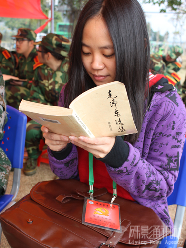 当2013级新生在训练场上叱咤风云不需要服务的时候,党员志愿者则在服务点静静守候。为了不浪费一分一秒,党员们都会自带书籍认真阅读。“星星之火,可以燎原”“一切反动派都是纸老虎”……微弱的读书声营造出浓厚的学习氛围,本科生第十党支部的李梓妍同学说道:“我们大三的7日已经考完试,过来值班没有考试压力,可以顺便读读之前准备的经典书籍。”为了方便值班的同学,服务点处存放了些书籍和杂志,可供值班的同学阅读。