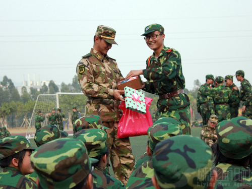 “我们来玩最后一个游戏,请对左边的同学说我爱你,对右边的同学说不要脸……”即将收操,五排的教官带领大家玩了最后一个游戏。学员们围成大圆圈玩得不亦乐乎。教官受访时表示:“其实我想表达的话就是我爱他们!大家都特别棒!”当这位帅气的大小伙子拿到学员们赠送的相册和礼物时更是数度落泪。