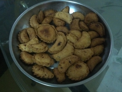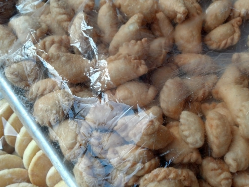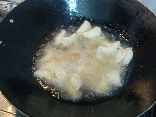 示范油角制作过程的是一位年迈的老奶奶。在制作过程中,她使用碎花生和白砂糖作为馅料,她热情地介绍说可根据个人喜好加入干椰丝或芝麻粒;而皮料则是在面粉中加入了会使面皮起酥的猪油;在包裹馅料时,她特意强调要注意表皮不要粘到白砂糖,以免油炸时变焦;油炸过程中为了受热均匀,要用筷子对油角进行翻面。待表皮出现起酥时,油角就制作好了。据悉,将炸好的油角用食品袋封好,置于阴凉干爽的环境下,可保存一个月左右。
